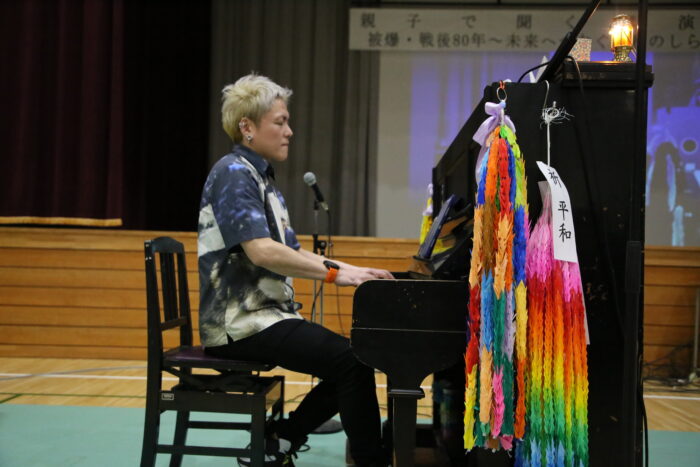 矢川光則さんをお招きし、「被爆ピアノ」の活動映像の視聴と講話を行いました。講話後には、本校卒業生でピアニストとして活躍されている川代祥治さんによる被爆ピアノの演奏が行われました。今回は在校生とのコラボレーションを交え、演奏を披露してくださりました。