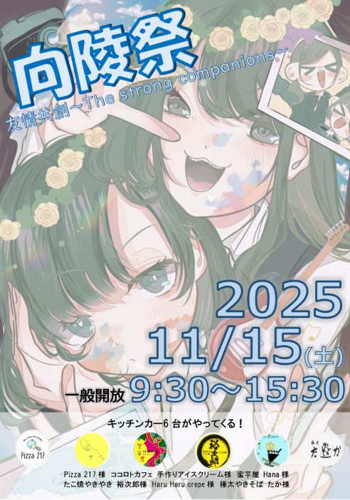 お知らせ 令和7年度向陵祭のお知らせ No,2 11月 6, 2025 0 328 向陵祭についてお知らせします。 日時:11月15日(土) 一般公開 9:30~15:30 今年はキッチンカー6台が登場!バリエーション豊かなメニューをお楽しみいただけます。 以下のポスターでご紹介しています。ぜひ、ご覧ください。